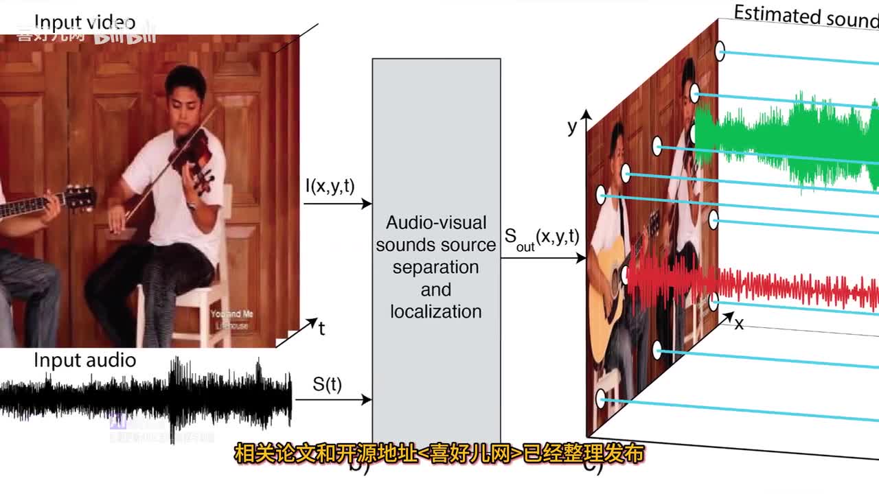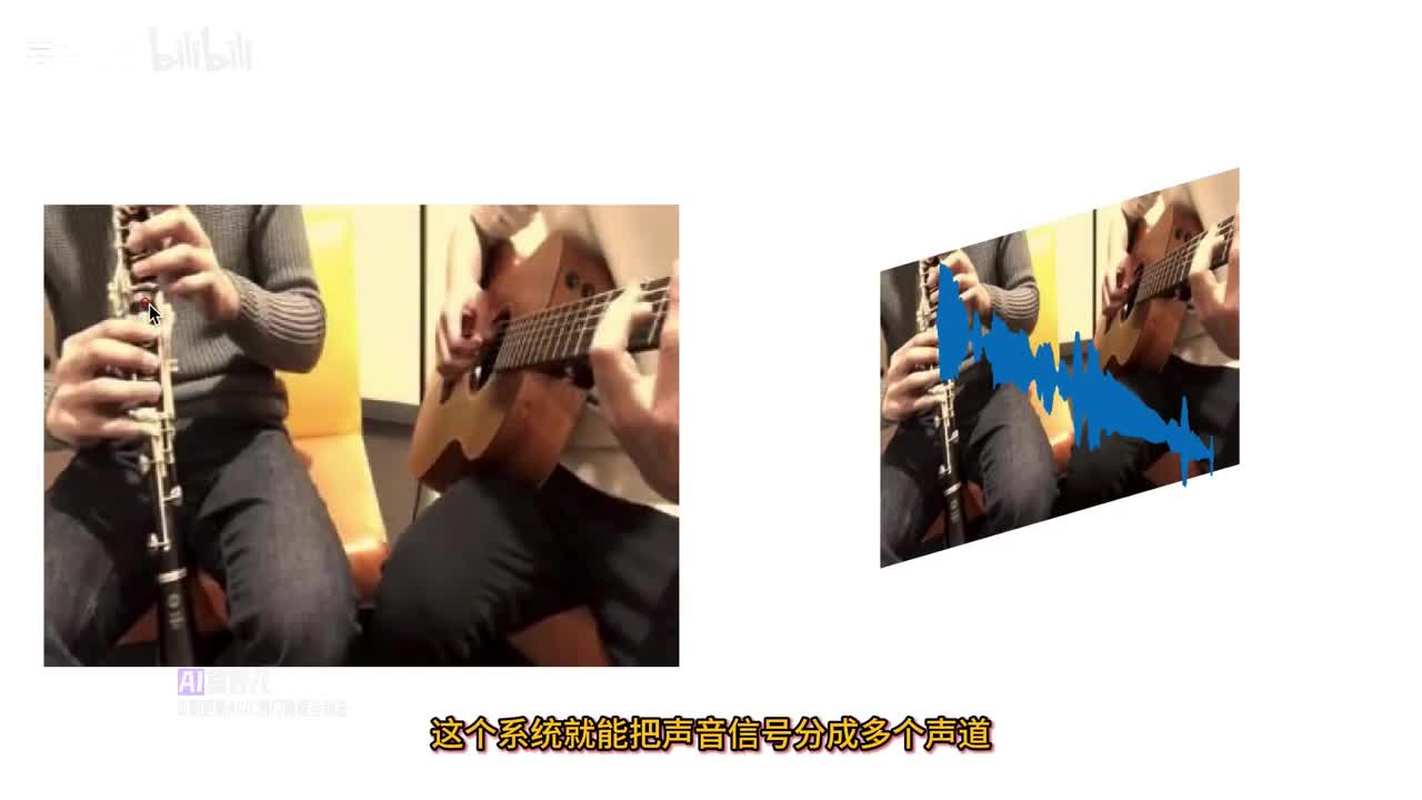例如你在看一个乐器演奏的视频,这个系统就能把声音信号分成多个声道,每个声道对应不同的乐器类别。