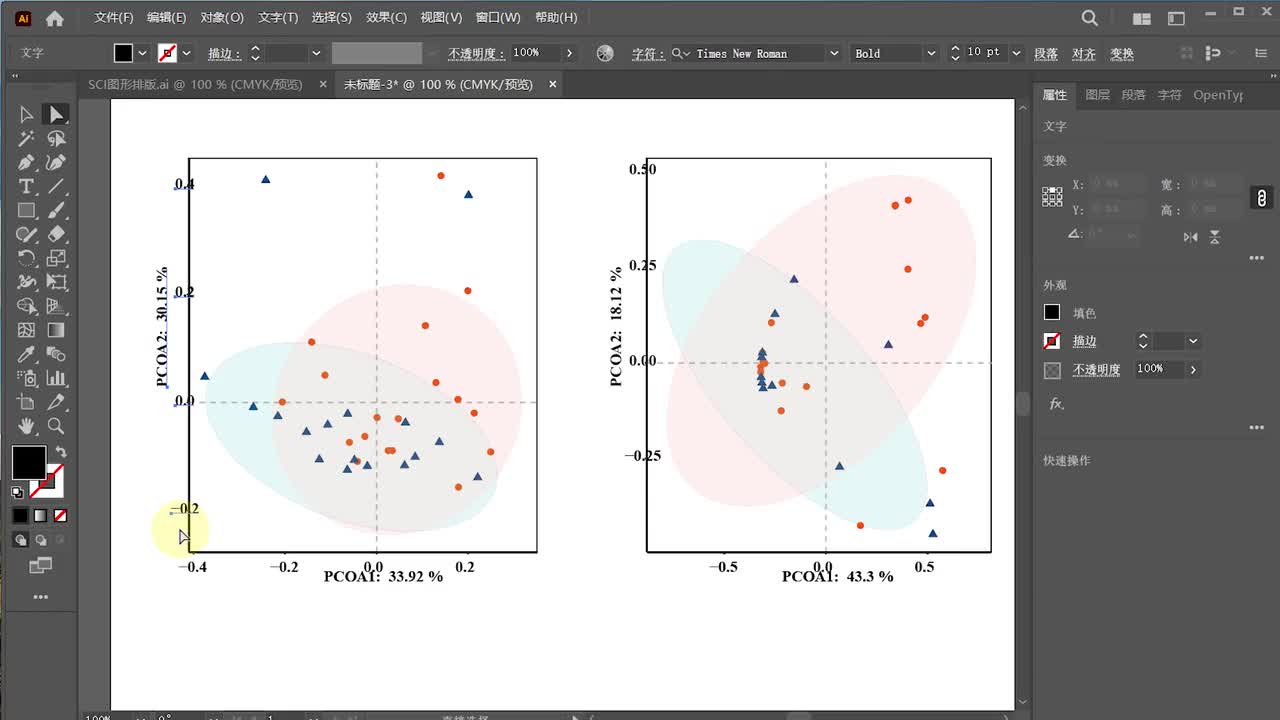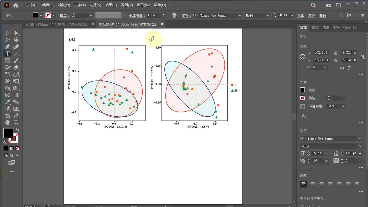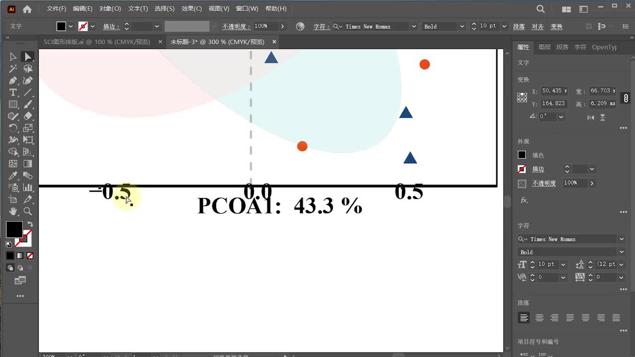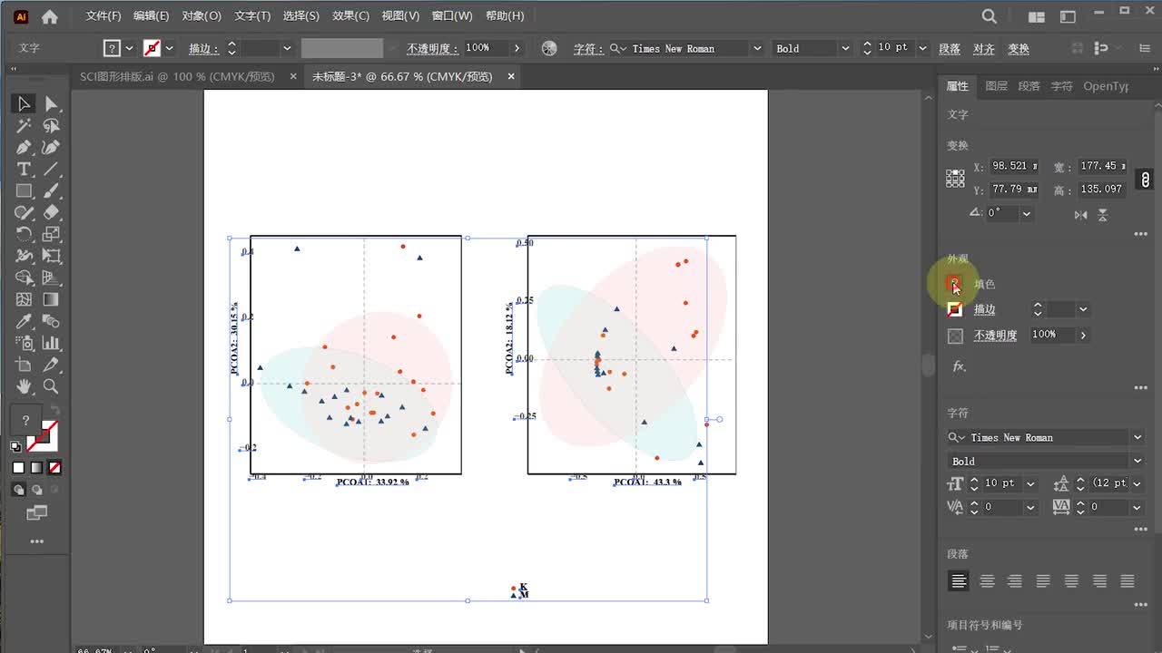 选中这个字体之后,我们把这个字体的改成time是new roman。然后加粗,底大小更改为十八。然后发现它这个字体这个是黑色的,这个字体它并不是黑色的,我们顺便把这个填充的颜色更改为黑色。弄完之后发现它这个字体的位置都已经有变化。我们需要对它这个位置进行移动,使用这个选择工具,直接选择工具,然后按住shift键选中这个字体。