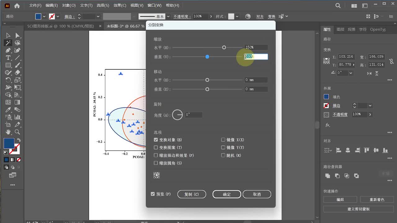 变换这个选择分别变换,这样它这个水平和垂直都设置为一百五。让它整体扩大一下。然后点击确定,同样的选中这个圆。点击对象变换,分别变换一百五,点击确定。