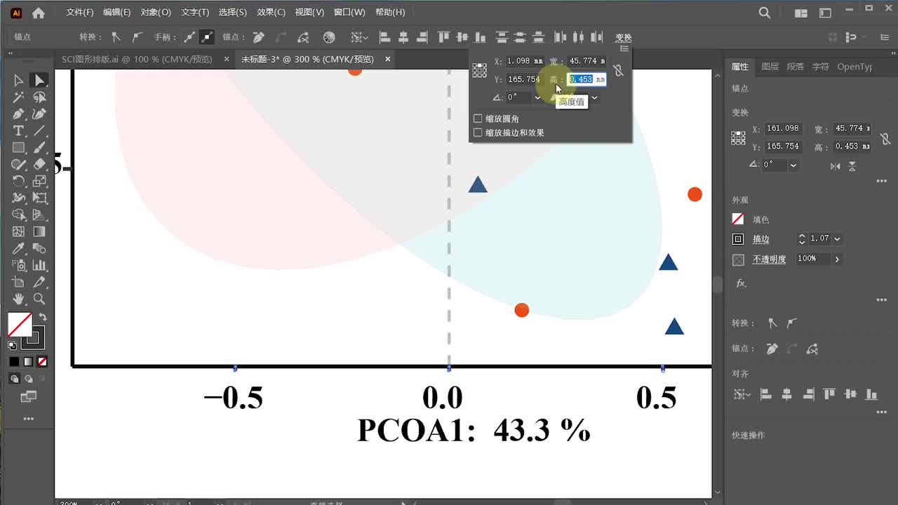 这个变换我们更改它这个参考点,以上面为参考点,然后这个高度只调整它这个高度,高度也更改为一。然后把这个图形的一个也更改一下,然后选中按shift键。选中之后,高度更改为一。接下来更改一下它这个轴线,发现它这个轴线就是太细了。我们使用这个魔棒工具,然后点击一下这个线。