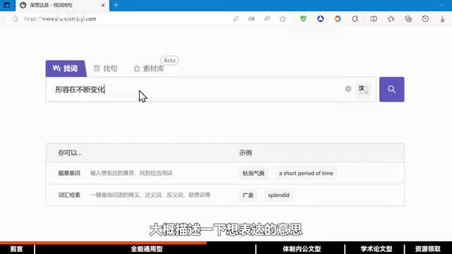 第一个解决词句灵感,有些东西还可以,就是想不起来该用什么。词语或者句子去形容描述的时候,你就可以直接去这个网站,大概描述一下想表达的意思。它呢就能够帮你生成一批对应的词汇,还可以用同样的方法来搜句子,用一些金句来给你的内容增加亮点。