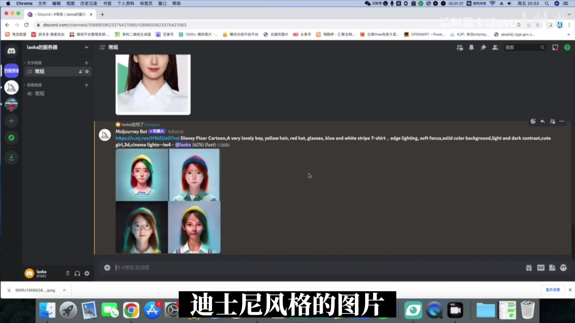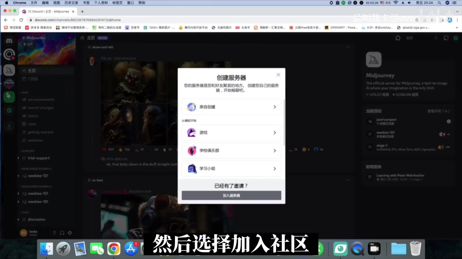 然后点击made journey b o器,选择加入服务器服务,选择我们刚刚创建的的服务器,点击授权,点击网页左侧创建的服务,然后选择选择图片,选择一张我们想要设计的图片。