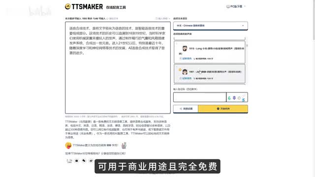 第二个,t t s mak可用于商业用途,且完全免费中文,共计六十个音色,还可以自定义高级设置,使用非常人性化。