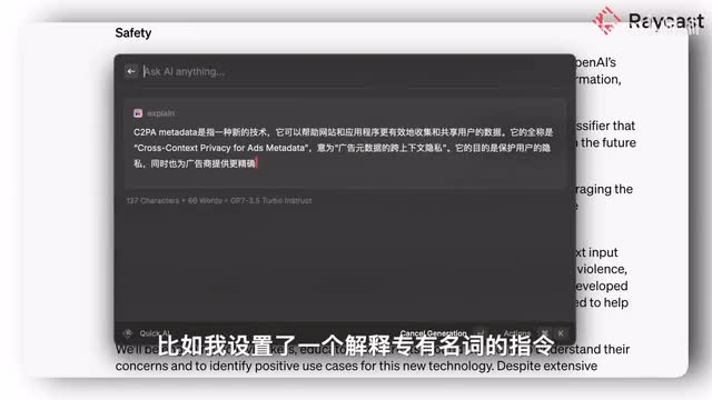 解释一个函数。搜索一个概念。当你可以想到的方方面面,x r g p t能做的事情都可以绑定到一个系统级别的快捷键上。甚至你可以定制专属于自己的a i指令。比如说我设置了一个解释专有名词的指令之后,我在任何地方选中一个我不懂的重要名词,都可以直接让chat g p t给我解释出来。r e a t store中海量的插件生态,也都能直接调用request a i服务的a p i,而不需要额外的付费。