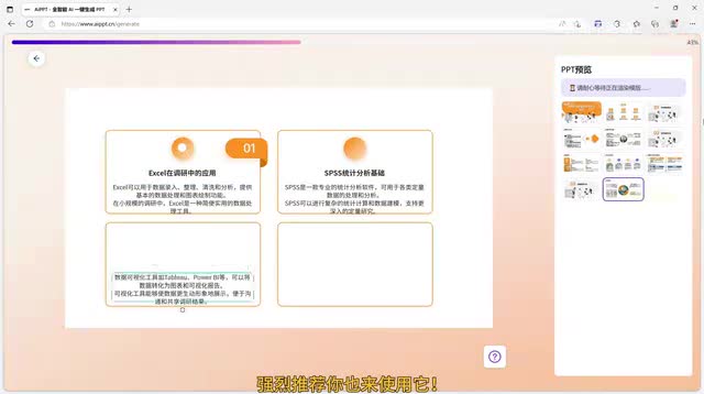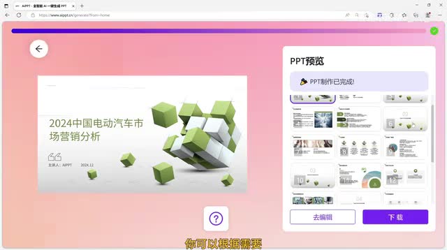 选择好后,点击这里即可生成p p t生成速度非常快,品质和时间点是人工的几十倍。你可以根据需要对生成的p p t进行形式和内容上的微调编辑,然后导出为p p t文件,一个p p t的制作就完成了。