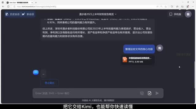 这是一篇八万六千多字的上市公司半年报,千头万绪,不知道从哪里开始看起,把它上传到kimi,马上就可以为你提炼出年报的核心内容。八万六千字,这还不是kimi的极限,kimi可以一次性处理二十万汉字的长文本,是全球唯一能做到如此大篇幅汉字输入的a i大模型。