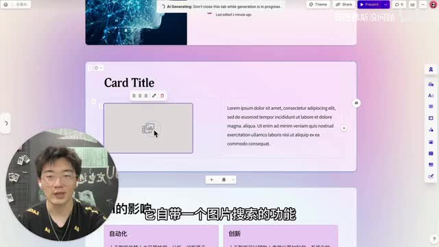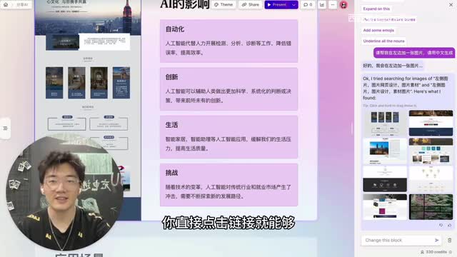 在这里它就加了一层,加了一页,然后我们就可以修改我们的文字,包括我们的图片。然后它的图片的功能也是非常强大的,不需要担心一些辅助的图片网上搜不到,它自带一个图片搜索的功能。也可以在on splash上去搜搜一些图片,比如说搜出来这些a i的图片,对。然后他的。