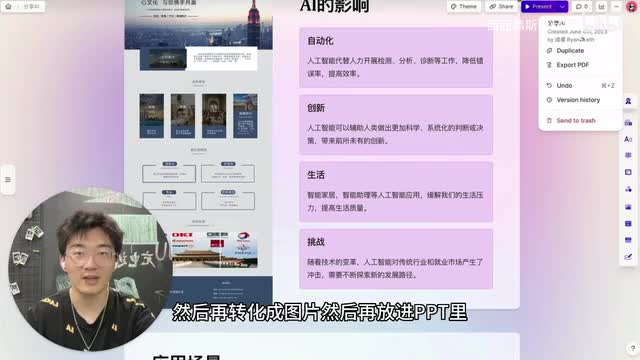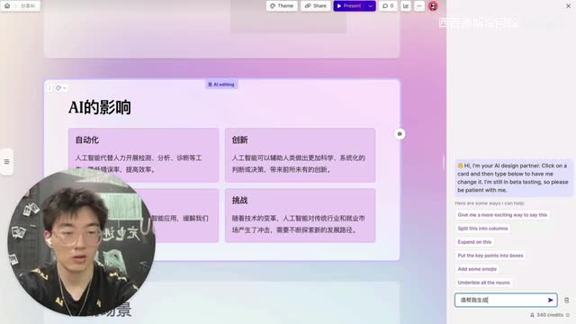 像是在做这样一件事情之后,我就简单尝试一下它的功能。不过坦白说很多人觉得ai生成p p t很快很方便,但事实上如果效果不好的话,生成成本非常的高,最后还是需要我来改。不过我发现伽马已经做的是非常不错了,我觉得能够生成到百分之五十的一个程度。虽然我觉得还是和我想象的有点差距,但是让ai帮我去打一个草稿之后,我们再去修改已经是挺快的。