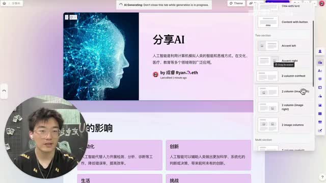 还有一些其实还可以插入一些网页。比如说这边可以嵌入一些视频,然后嵌入一些app嵌入一些网页,然后还有一些好用的一些小组件。当然它还有一个ai助手,你可以这边呼出他的一个a i助手,然后你和他去进行一个交流。比如说你想让他这一页怎么怎么样,对,你可以去你可以跟他说你的需求。