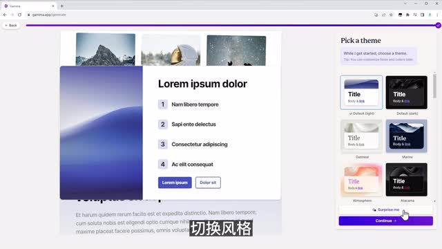 都确认好了之后,点击continue即可生成。如果对于生成的风格不喜欢,可以点击surprise v切换风格。也可以在上方的区域手动选择合适的风格。