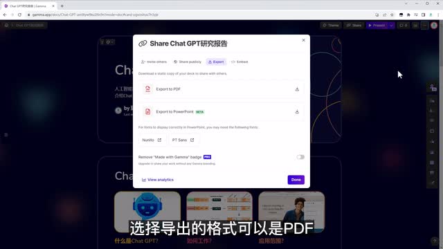 总体来说效果还是不错的。最后导出也很方便,在右上方点击三个点选择导出。选择导出的格式,可以是p d f也可以是p p t的格式,点击即可一键下载到本地。
