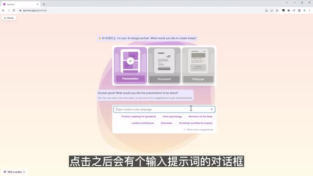 这三个选项选择,第一个是生成p p t,其他两个分别是文档和网页。页面点击之后会有个输入提示词的对话框,这里是支持中文的,不需要切换语言。这边我们需要输入一个主题,它会根据主题生成一份大纲。