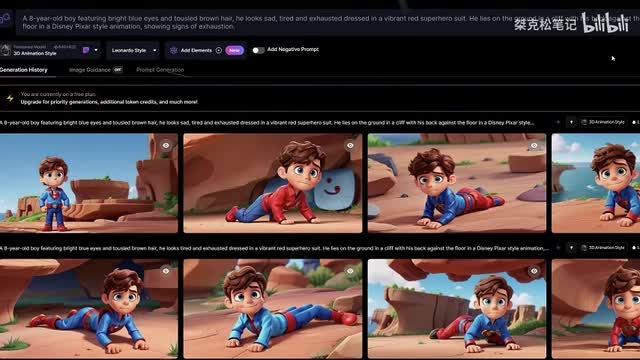 我会开启这个h e cruise pop scale,让影片画质更好。汤米要跟邪恶的一方对抗,他可能会在保护我们的时候受伤。所以我打算生成一个他受伤的图片一样,图片主角要完全到超之前的指令,才不会电影到一半观众发现怎么换人了。一个八岁小男孩,蓝眼睛,棕色头发,脸上有一些瘀伤,穿着红色的超级英雄装,他在断崖旁边躺在地上,用迪士尼皮克斯风格动画呈现。出现这个讯息content moderation filter,原因是当我的指令中有男孩波这个关键字的时候,系统会自动过滤。如果加上暴力,例如受伤、遇伤或是血都会被挡掉。