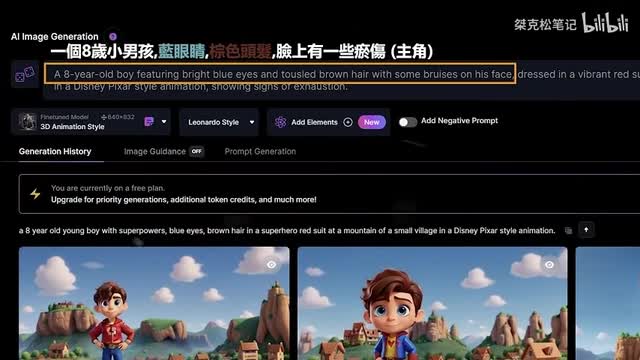 而不是我今天要做的是是。倪风格,所以我会选c d animation style。输入指令之前请记下这段公式,今天会用到很多次哦。图片主角主角状态包含姿势、服装内容、地点、风格。一个有超能力的八岁小男孩,蓝眼睛,棕色头发,穿着红色的超级英雄装,在一个山上的小村庄用迪士尼皮克斯风格动画呈现。数量可以自己决定确认for the real汉克米是取消选取的状态,你才不会生成一次就用掉十五到二十以上的点数哦,选一张你喜欢的。