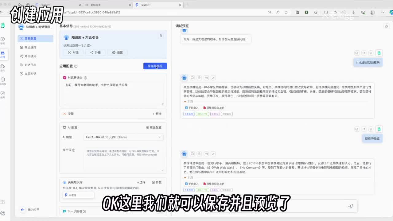 可以看到他已经更改过来了。然后我们再问他一个不是知识库中的问题,蔡徐坤是谁?我们可以看到歌的背景啥的,也都回答出来了。ok这里我们就可以保存并且预览了,这样的话我们就可以随时提问我们刚才上传文本的所有专业性问题就会回答的比一般的chat g p t更加准确。