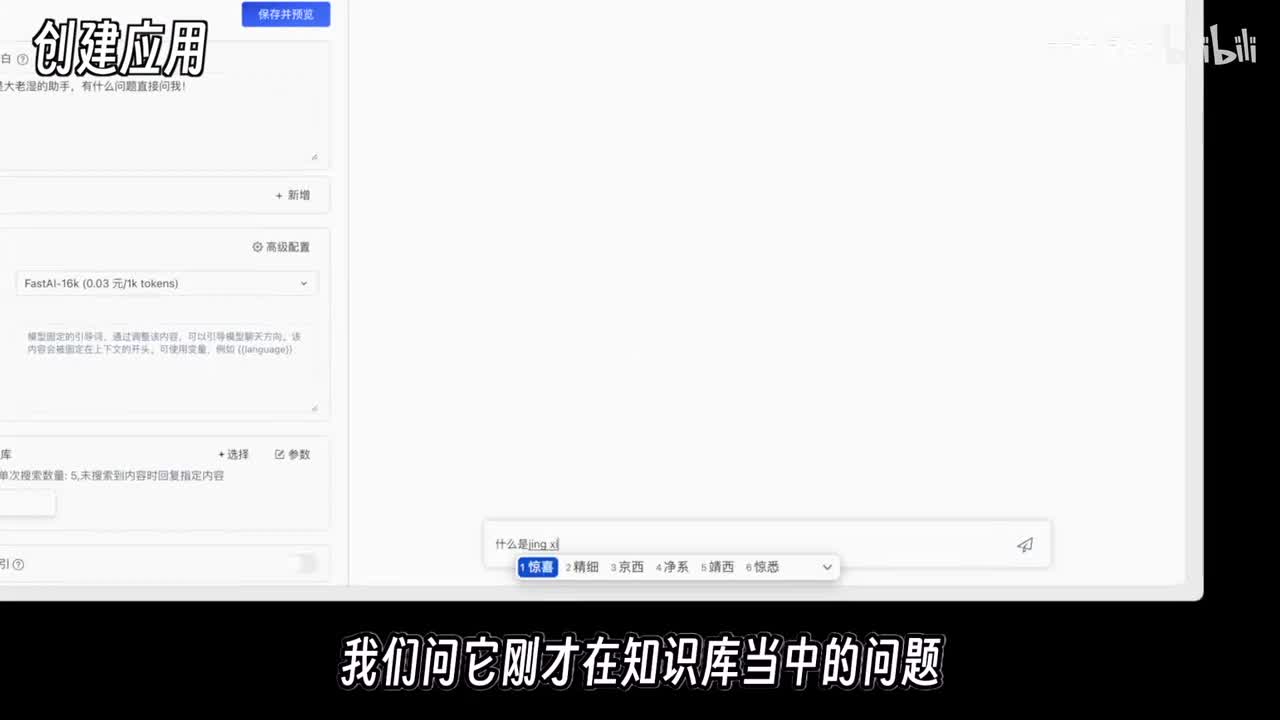 然后我们再选择一下刚才设置的知识库,ok这样的话大体就算完成了。我们可以在右边测试一下,我们问他刚才在知识库当中的问题。ok可以看到他迅速回答出来了。如果你觉得他回答的不够准确,我们也可以在这里点击更改,然后我们再问他一下。
