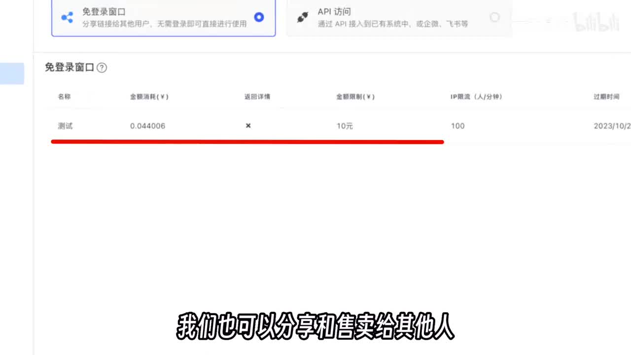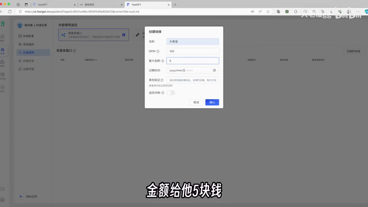 如果想售卖给其他人,就可以点击外部使用这个窗口,这里直接点击创建新链接。这里的名称我们也是随便填写一个金额给他五块钱,然后过期时间设置一天。设置完成后,我们点击右边三个点复制。然后我们打开这个链接就可以直接使用这个a i了。