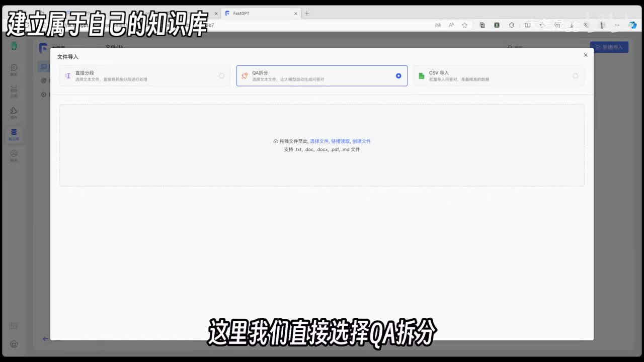 知识库就是我们需要让a i处理的文本,我们点击右上角新建,然后这里随便命名下o k创建之后我们点击导入数据,这里有四种导入方式向直接分段。q a拆分c s v导入,我们都可以选择。这里我们直接选择q a拆分,然后把这个关于颈椎病的文件导入o k拆分成功可以看到它把我们刚才上传的文本拆分出了许多问题,这些问题我们可以浏览一下,如果有不对的话,都可以随意修改。ok有了知识库后,我们就可以直接开始正式创建应用了。