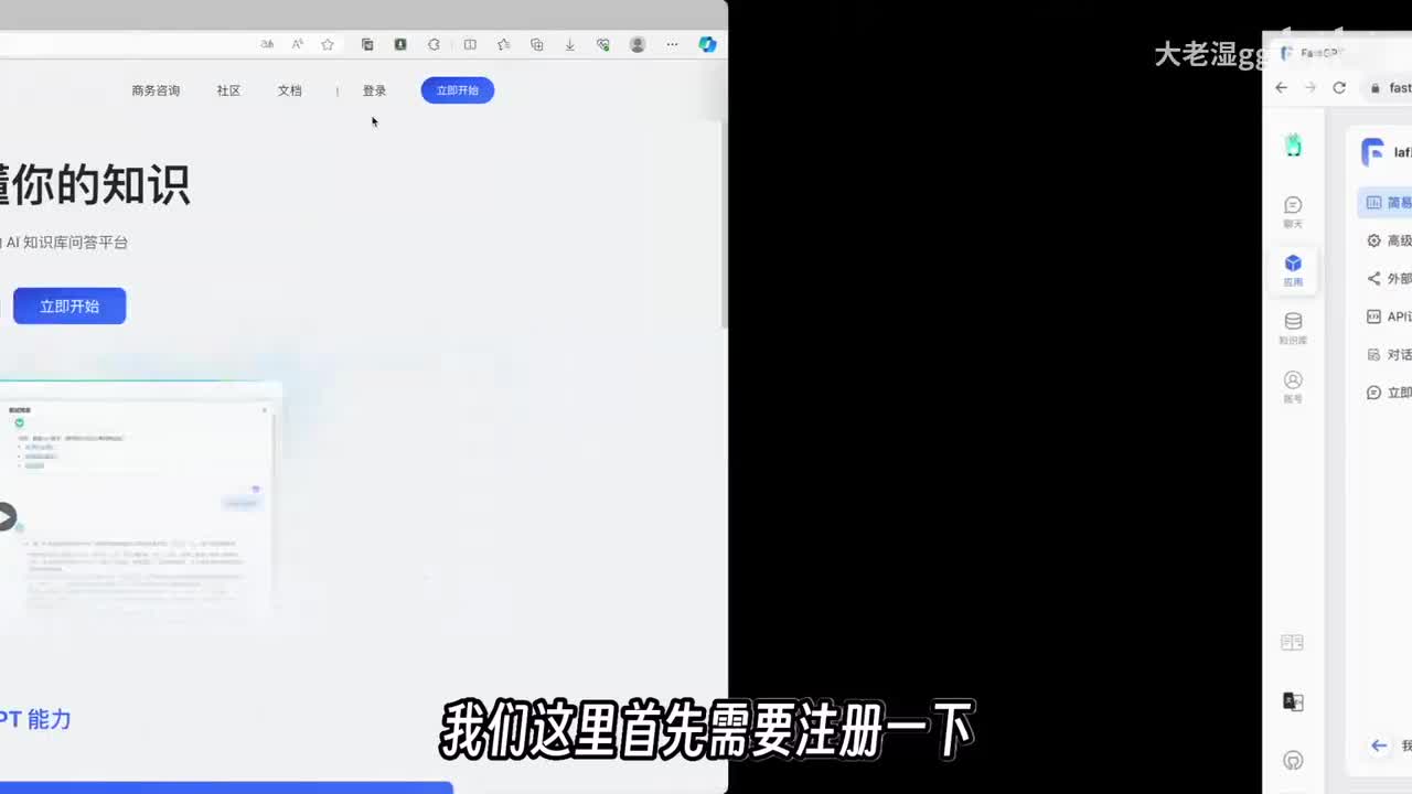 然后fast g p t是一个基于l m大模型的a i知识问答库,就是我们可以把我们不懂或者很长很难读的资料喂给他,然后他会经过ai处理回答我们提出的问题。我们这里首先需要注册一下,ok这时候就算正式进入了。我们刚进入时,像这些应用知识库这些都是空的。我们首先第一步就是要建立起属于自己的知识库。