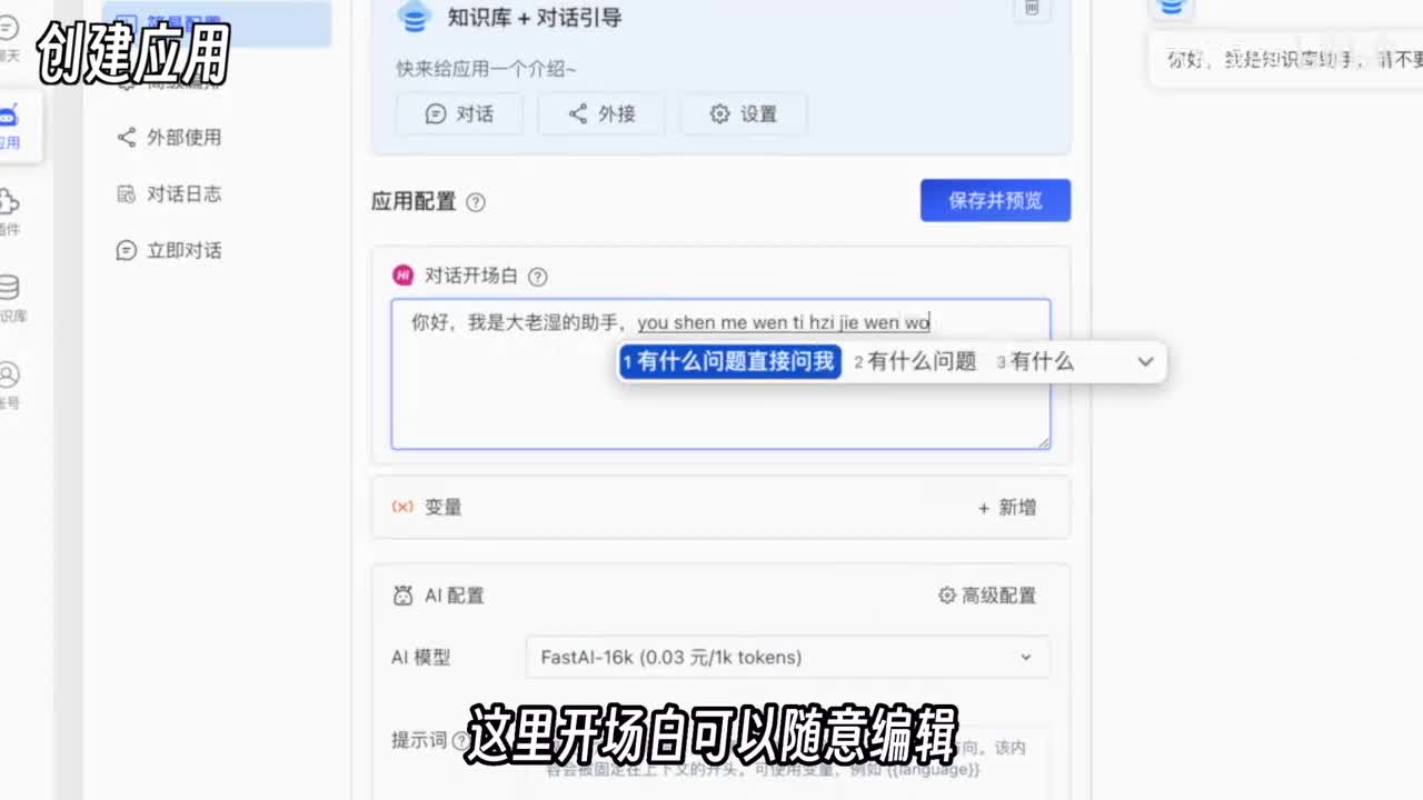 我们这里选择第二个,然后点击确认,然后可以看见左边这一排有你的ai小助理的所有配置。我们先来看简易配置,这里开张牌可以随意编辑。然后对话模型这里有很多哈,像咱们国产的文心一言等等等等。这里我们还是建议选择fast g p t比较好用,因为这个模型就是chat g p t的模型。