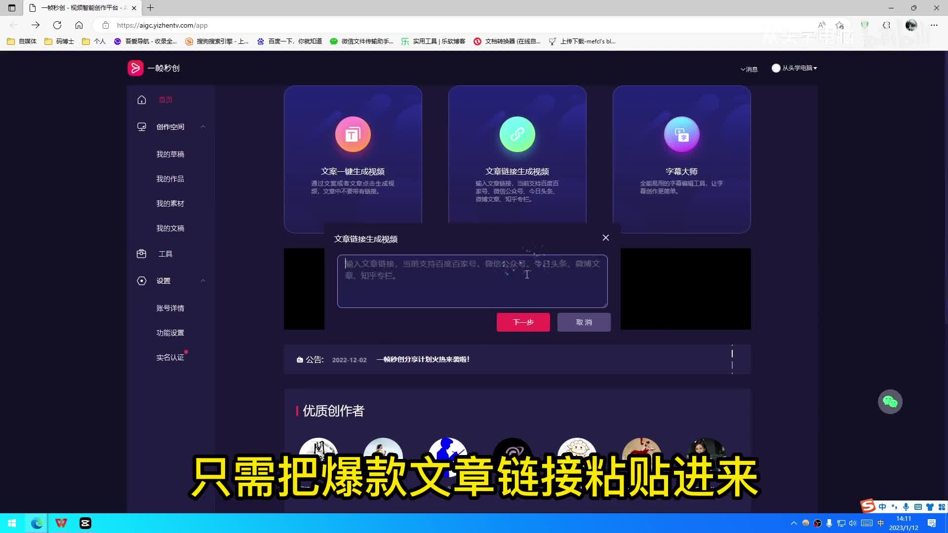 如果你连文案都不想写,只需把爆款文章链接粘贴进来,系统就会自动识识别文案,并且帮你自动生成视频。