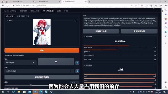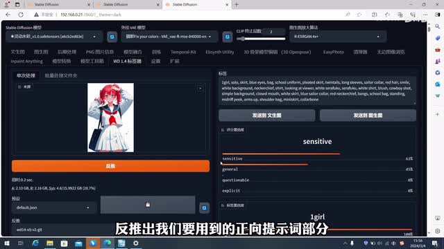 点击上传一张参考图。然后它会自动进行反推,反推出我们要用到的正向提示词部分。那么标签这里呢就是我们所需要用到的正向提示词,我们将它进行复制。