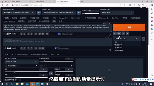 把我们刚刚复制的标签粘贴到正向提示词中,然后加上适当的质量提示词。将它填入。好,那么我们的提示词部分呢就已经完成了。