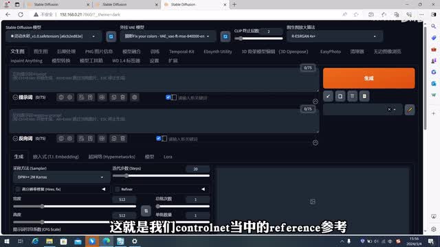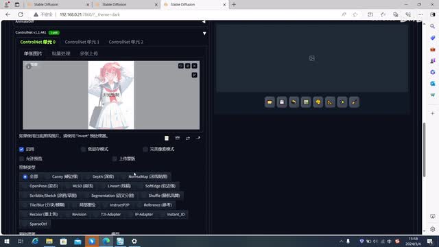 打开我们的control net。上传我们的参考图。要勾选启用完美像素以及reference。