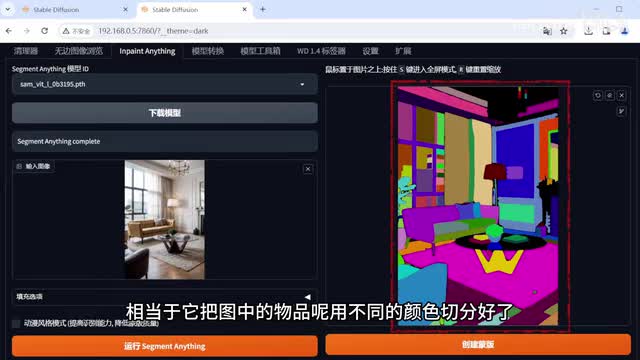在右边这里呢就给我们生成好了一张语义分割好的图了。相当于他把图中的物品呢用不同的颜色切分好了,识别还是比较精细的。我们只需要把我们需要进行修改的,用画笔进行涂抹就可以了。