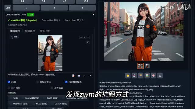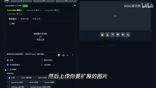 首先在s d的文生图里面启用control net,勾选完美像素模式,然后上传你要扩展的图片,勾选局部重绘,预处理器和模型都保持默认。