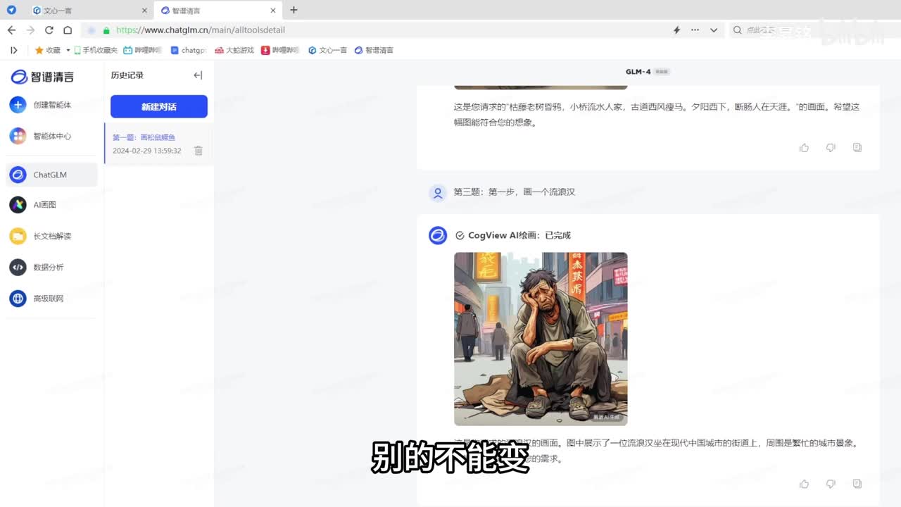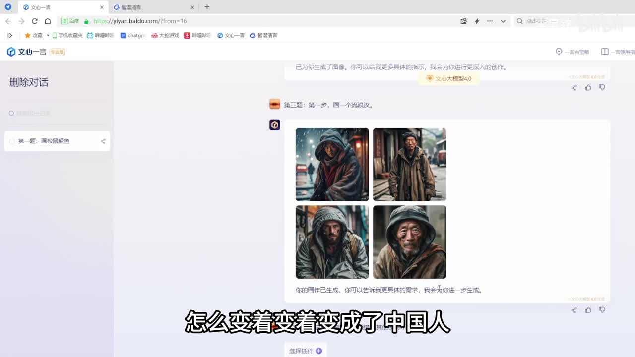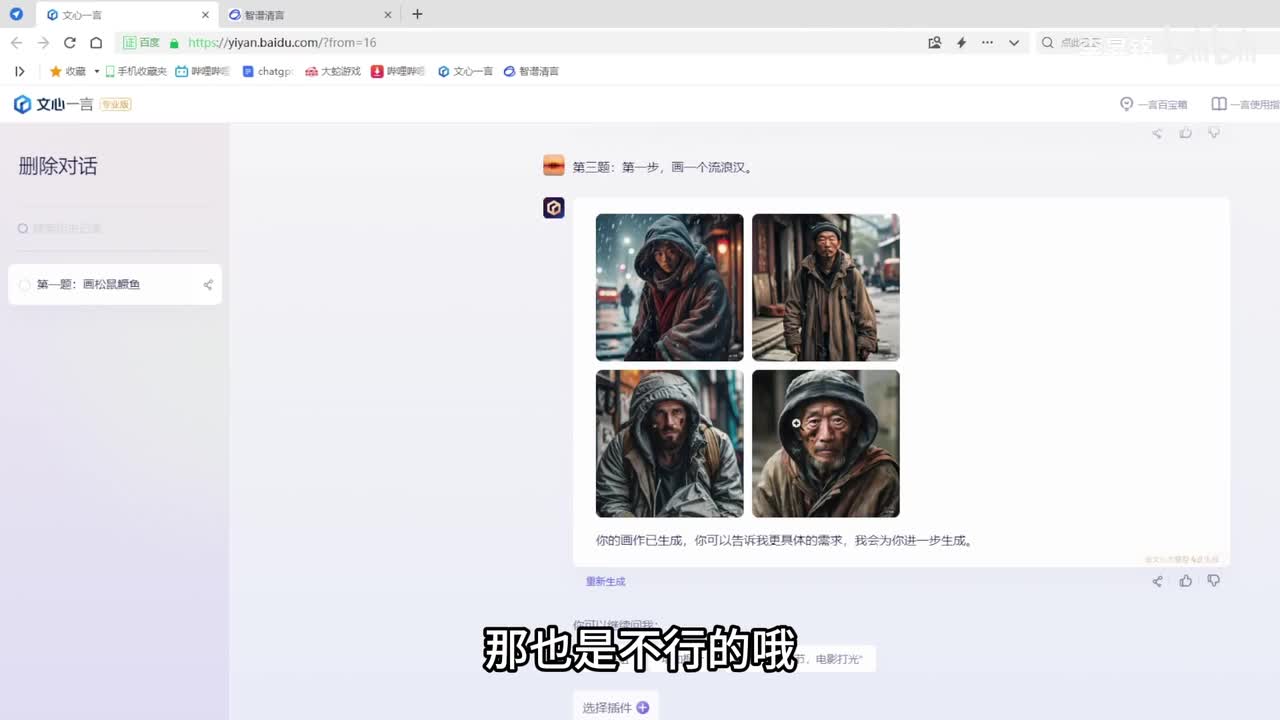 第一步让他画一个流浪汉,这个流浪汉还算可以吧。那我第二步呢就是让他给这个流浪汉戴上眼镜,只能让他戴眼镜啊,别的不能变,就是年龄啥的不可以变的。我们看看最后的表现吧,这个就很不错嘛。无论是流浪汉的身份也好,还是流浪汉的肤色也好,都没有发生变化。