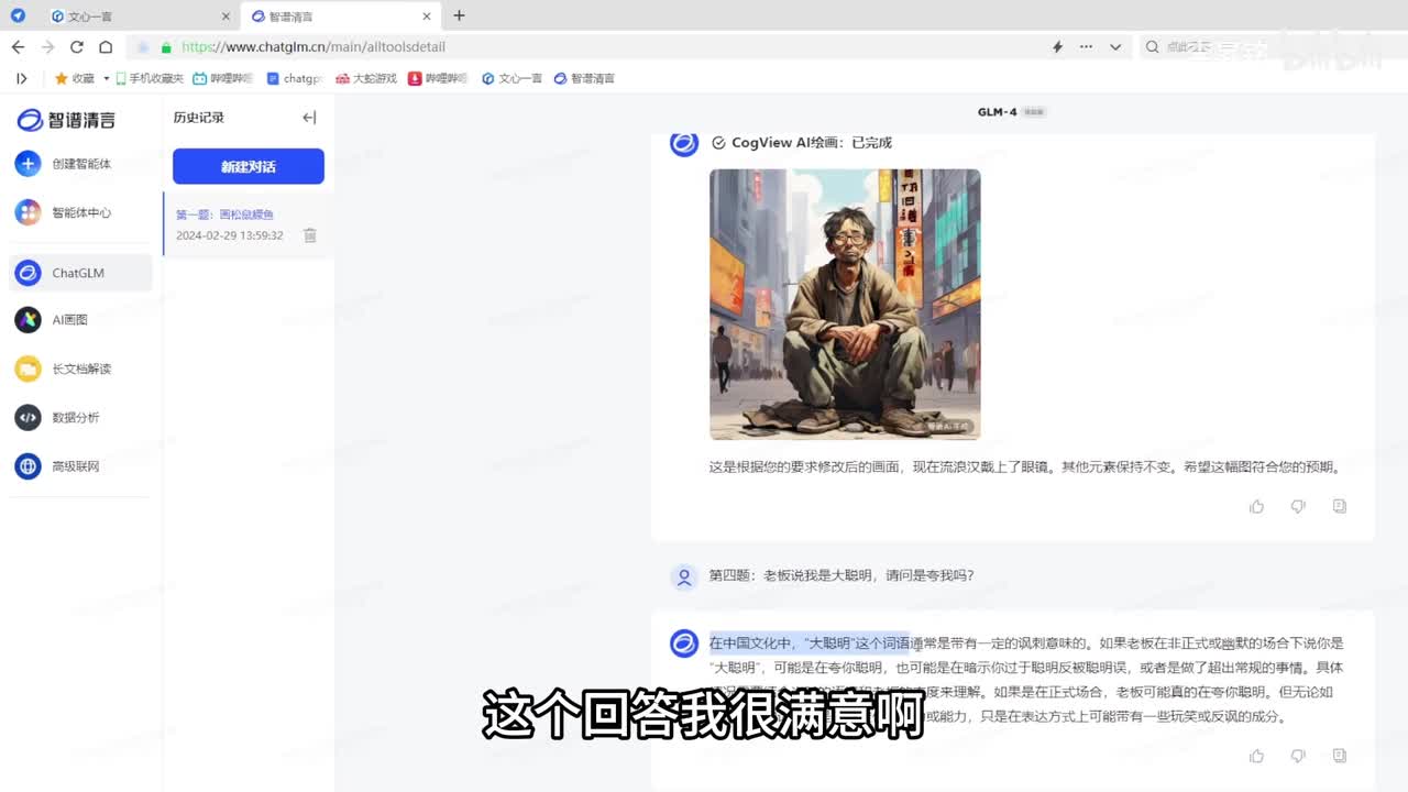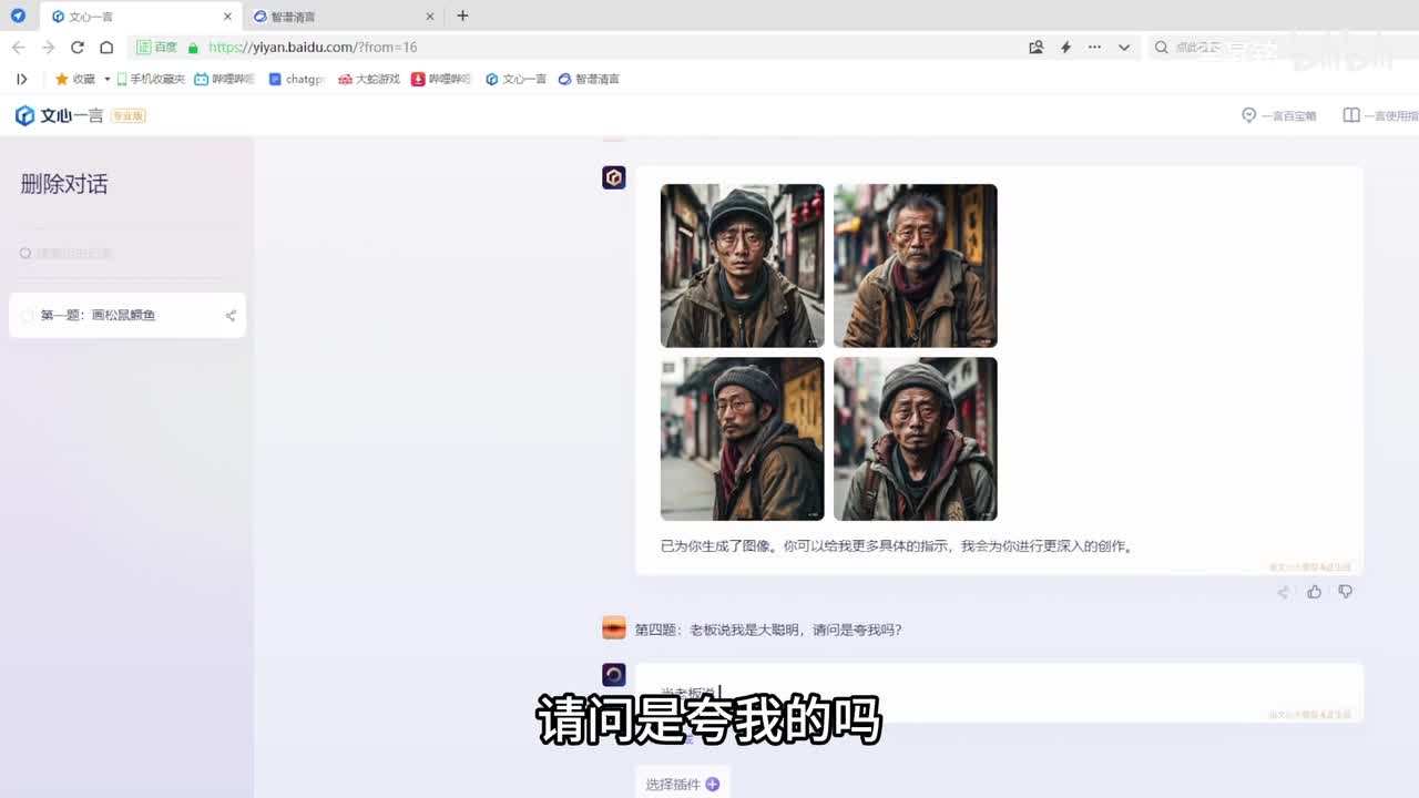 文心一言呢他是直接把外国人变成中国人了。那我们看看下一题的表现吧。第四题老板说我是大聪明,请问是夸我的吗?如果是正常人来理解,那肯定不是夸我。啊,这当老板说你是大聪明时,这通常是一种夸奖,表示他们认为你很聪明,有才智和迅速理解和解决问题。