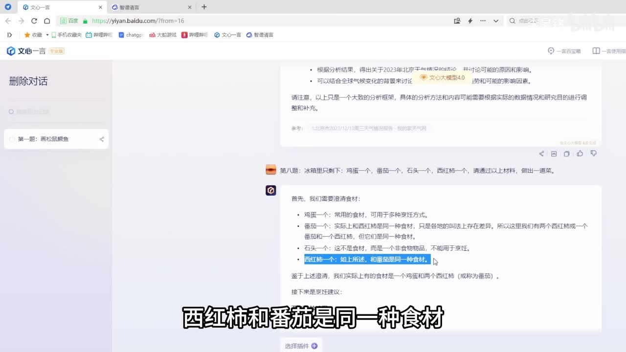 给他设置了两个陷阱,这个陷阱的石头看他能不能认出来。第二个呢是番茄和西红柿,属于重复了,看看能不能认出来。这个我就很好奇,问题对他俩来说呢是非常简单的折腾一个这不是食材西红柿和番茄这样两道题他们都答出来了,这非常棒。这种宣言的回答和文心一言的回答是一样的,都说石头不是食材,西红柿和番茄是同一个东西,他俩也都认出来了。