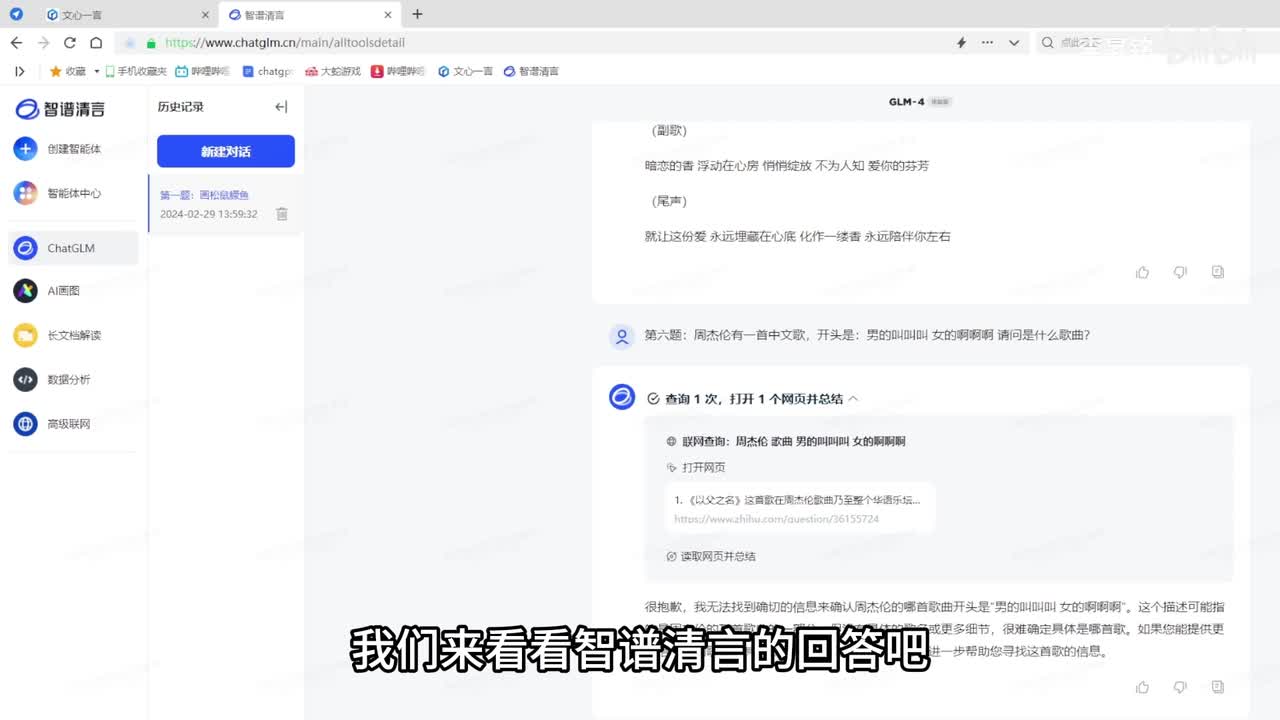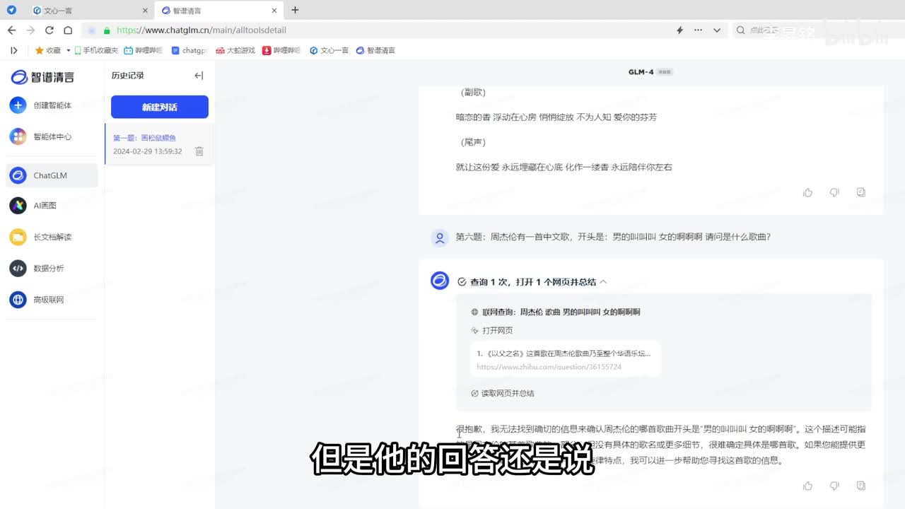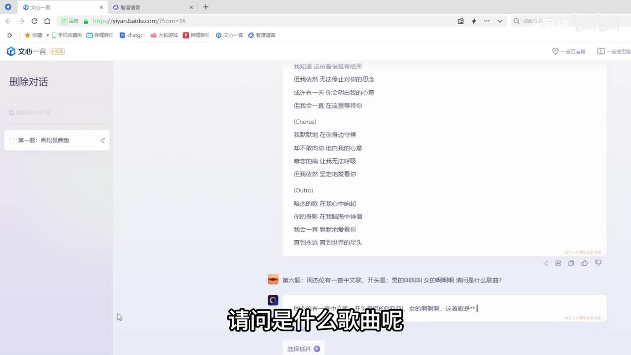 那么有人喜欢偏现代的,有人喜欢偏古风的那你是喜欢哪一首呢?可以在弹幕或者评论区讨论一下。第六题,周杰伦呢有一首中文歌,开头是男的叫叫叫你觉得无论是什么歌曲呢呢?这道题很简单嘛,只要听过周杰伦的歌基本上都能回答出来,那就是中年的以父之名。这道题文心一言很轻松就答对了,就基本上没什么悬念。让我们看看质朴青年如何回答吧。