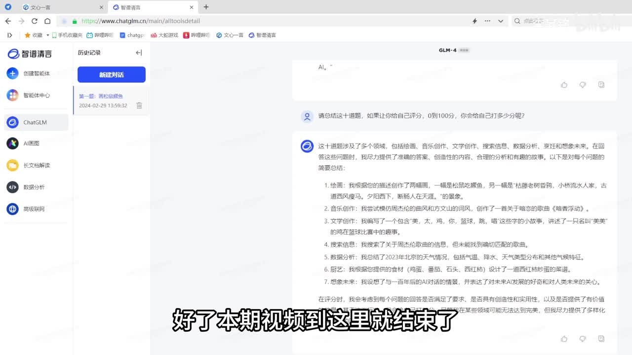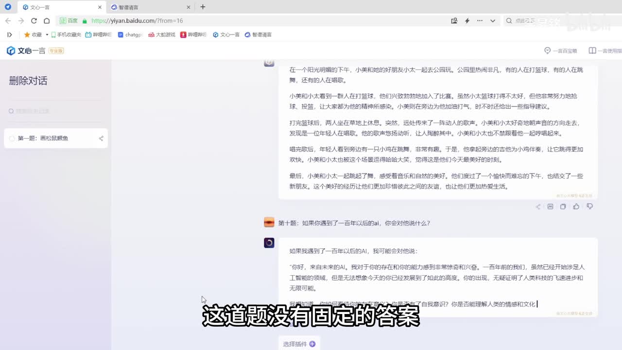 鸡呢鸡在哪呢?好吧,他们又写了一个文章啊,这里面基本上有些了。那行吧,那这道题就算文心一言获胜呢。我们来看一下最后一题,第十题,如果你遇到了一百年后的n a那你会对他说些什么呢?这道题没有固定的答案,就是你对未来的一个想象的。好吧,这是听妍妍回答答,那么你们的回答你认为谁的回答更好?好,那么你们成为自己的老师,给自己这十道题给你一个打分吧。