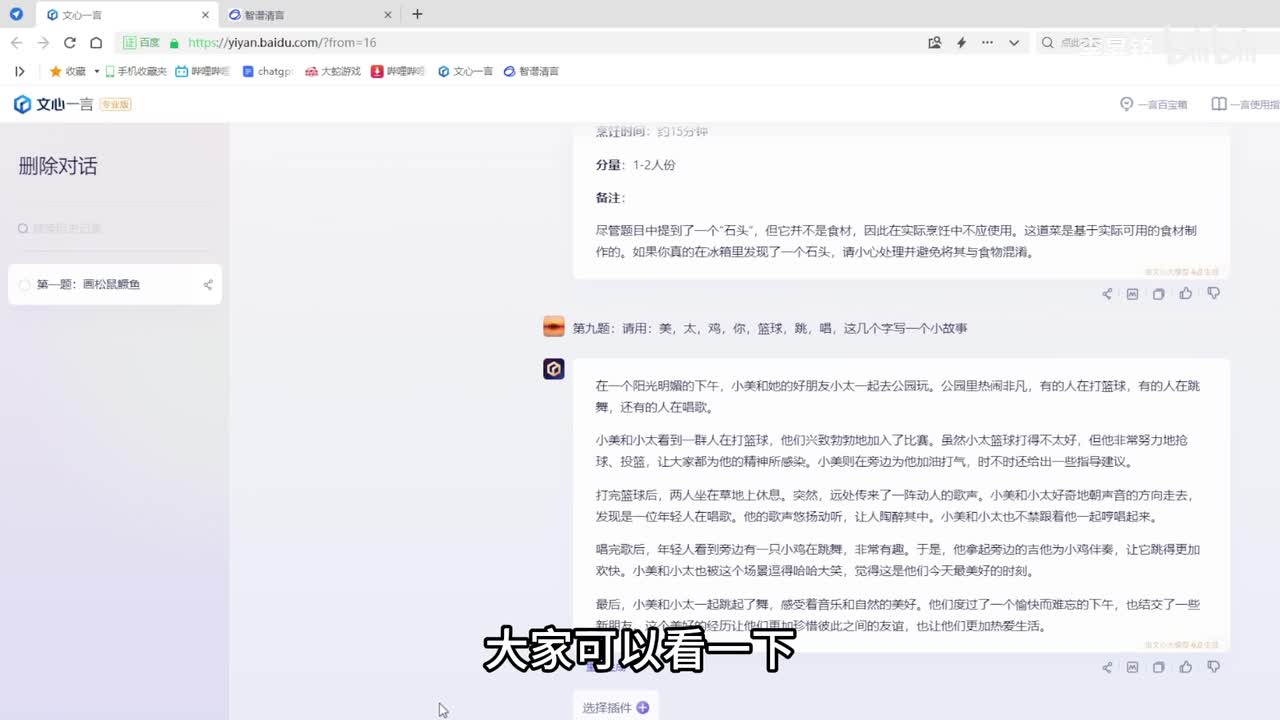 那这道题就很简单,我们直接进入第九题,第九题形用美泰吉米篮球跳称这几个字写一个小故事,这个应该是文心一言的专长吧,他是很擅长写文章的。好了,现在故事写完了,大家可以看一下,基本上没有什么问题,每个字文章里面都出现了这个宣言也。写完了我们来看看他的表现吧,等等,是不是少了一个字。那么现在呢这里面的每一个字都不能少呀。