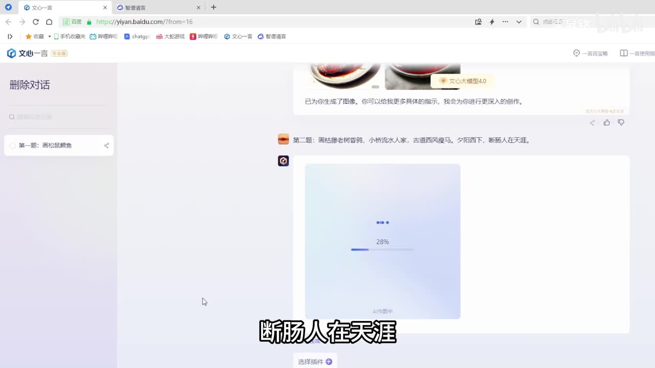松鼠吃鳜鱼,我没有让你画这个呀。好吧好吧,那我们来看一下第二题吧。第二题画,枯藤老树昏鸦,小桥流水人家,古道西风瘦马夕阳西下断肠人在天涯。那我们看看这两位选手又会有怎样的表现呢?我感觉这一点难度还是比较大的嘛,看看他们如何理解这段文字想要表达的意思。