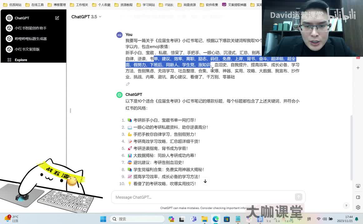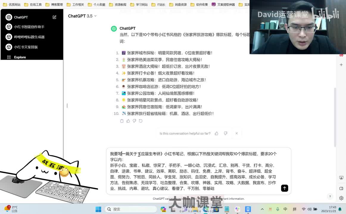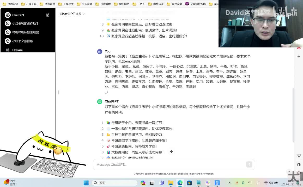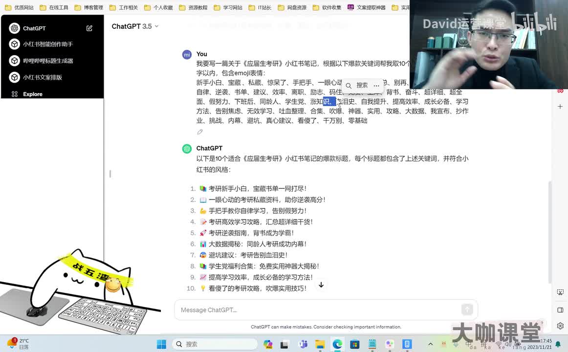 ok那么这是呃g p t三点五对吧?那我们这个这个地方提供的呃关键词哎并不多。那么我用呃我准备好的这个玩意儿,这个就是呃考研,也就是知识赛道的。我们看一下用这些东西我们能写出一个什么样的什么样的笔记。关于应届生考研的小红书笔记啊,请根据以下把这个热搜改为爆款啊关键词。帮我取十个爆款标题,二十字以内呃,包含。emerge表情。