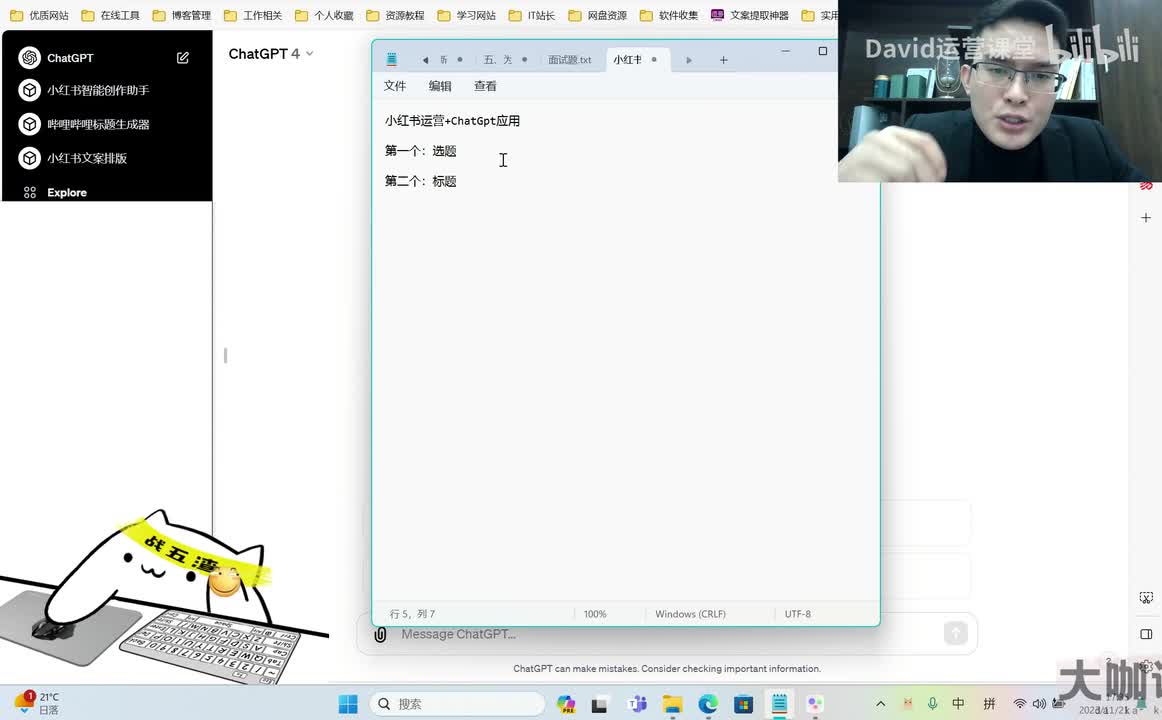 欢迎大家来到我们这一堂课。那么这一堂课呢我们讲的一个主题呢就是关于小红书运营加上这个chat g p t,或者说相应类型的这种a i的一个结合的应用。呃,就是在之前啊,我一直跟大家讲,就是呃我们现在啊自从今年也就是我们年初chat g p t的一个对大众这种普通人的一个爆发的这样的一个态势。到现在就是a i人工智能在各领域的一个应用,其实已经是呃非常的广泛的。那么我跟大家讲的就是呃,到目前为止,最需要掌握a i这一块应用的大概有两个行业啊,这两个行业呢你必须得会用。一个呢就是做程序员,也就是说搞开发的。