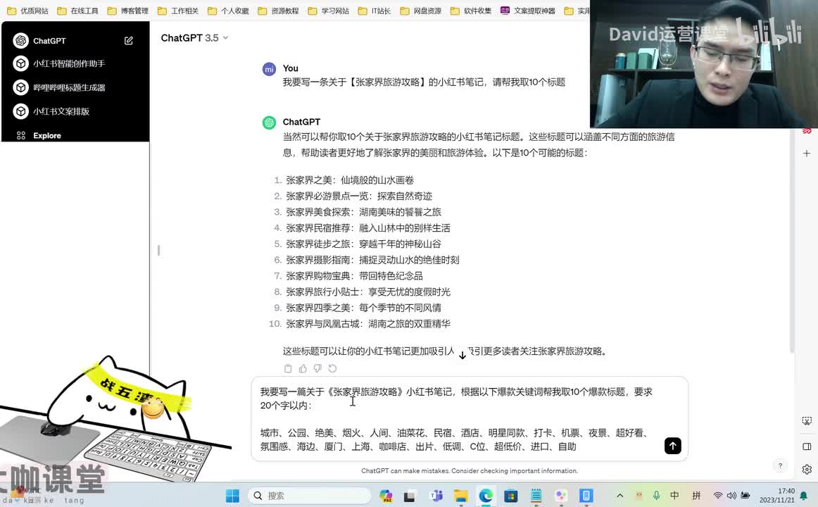 张家界旅游攻略的。小红书笔记。请帮我取。十个标题,我们看一下啊,他给我们写成什么样?ok这是他提供的标题。我们来看一下啊,张家界之美仙境般的山水画卷啊,张家界旅必游景点一览啊,探索自然奇迹,张家界美食,探索湖南美味的一个饕餮之旅好啊等等啊。那么这些标题呢你们觉得它可不可以啊可不可以用啊?其实如果说正常来讲呢用啊还是可以用的啊。