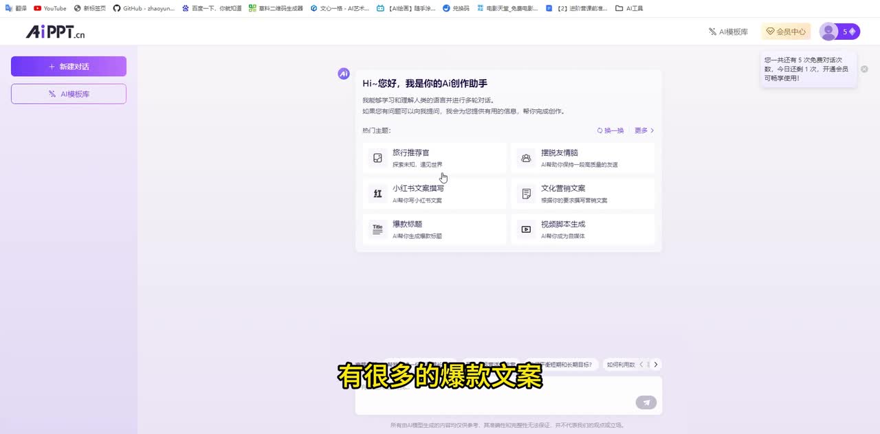 ai协助。创作的助手。这里呢就也是写文案的这一块啊,有很多的爆款文案,我们可以呃写一下,也可以是有点像g p d一样的。这里有a i的模板库。