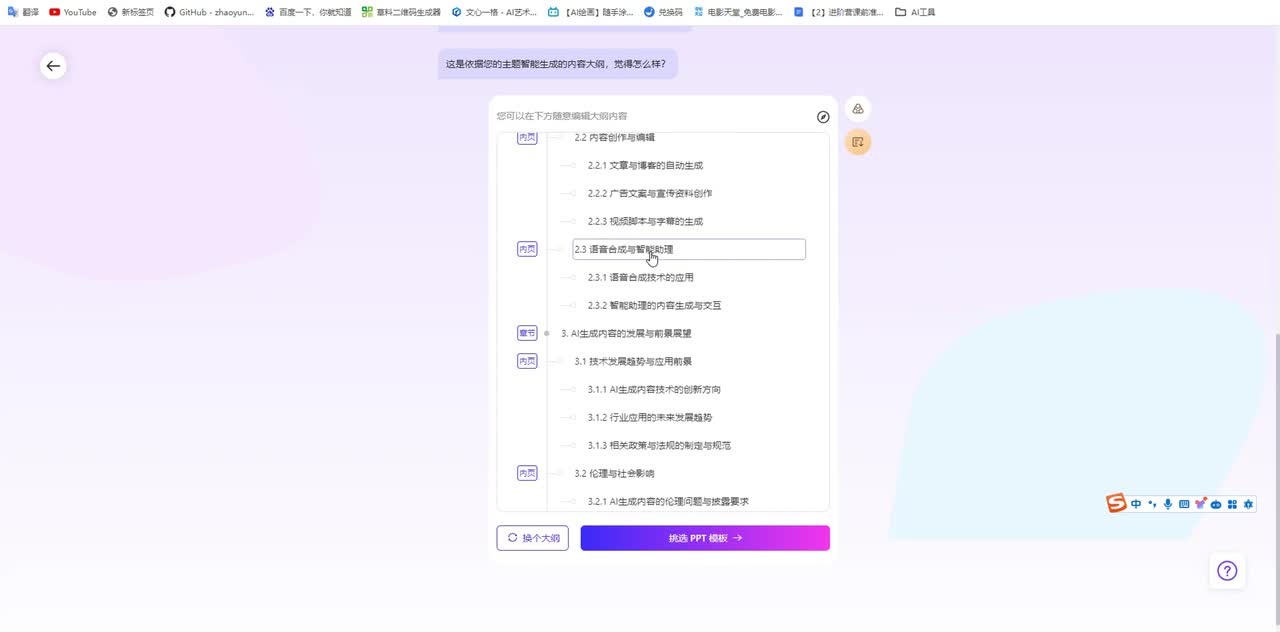 出来还是蛮详细的。那这里就是大纲呢,也是可以呃修改的啊,你可以修改,也可以换一个大纲啊,我们看到他写的也非常的详细。语音合成啊啊内容发展前景啊啊呃伦理社会啊挑战啊啊还有落地啊,未来发展计划啊,基本上像一本书一样的。然后我们现在就挑选p p t的模板。