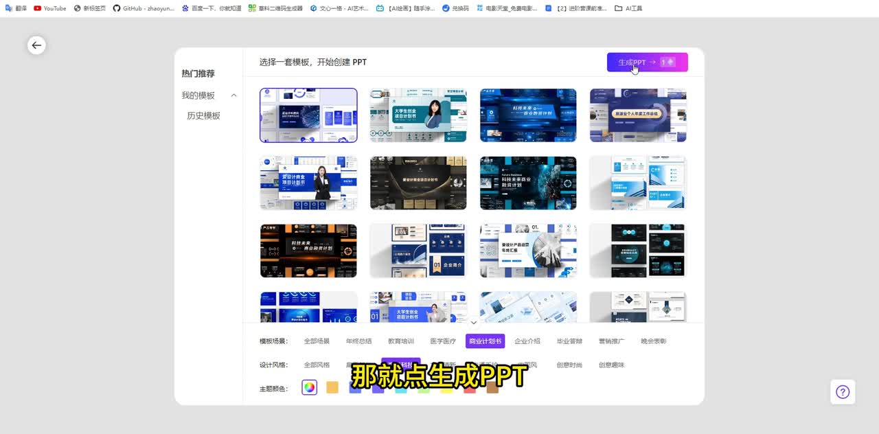 嗯,我看一下商业计划书的可能好看一点,你们选哪个好看?好嘞,比如。呃,这个也还可以啊,对吧?好,那就点生成p p t啊。然后它就自动的生成了。按刚才的内容。
