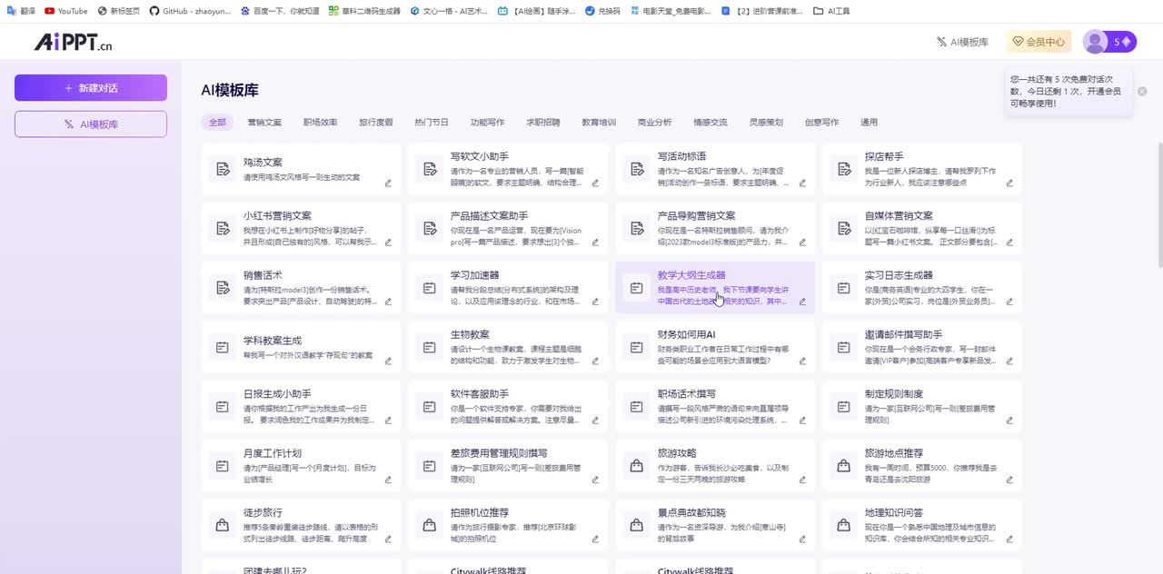 这里就有很多的模板使用,比如一些。导购营销的文案。教学大纲生成器啊,财务如何用a i。软件客服助手。