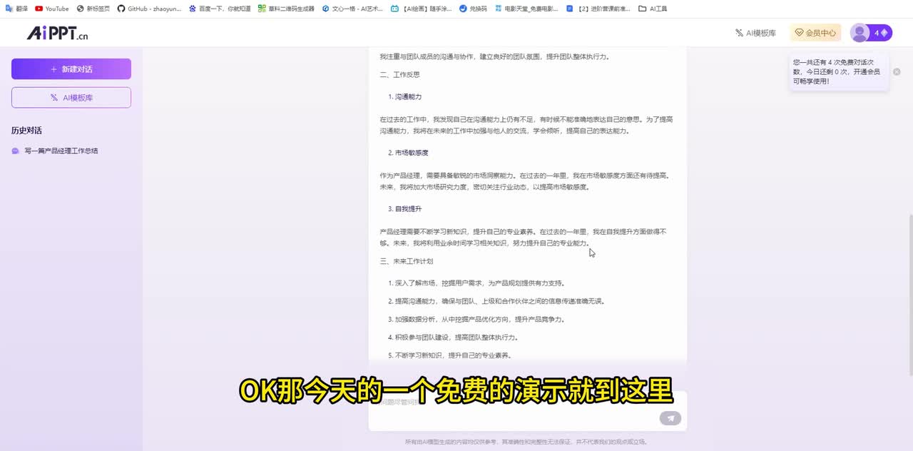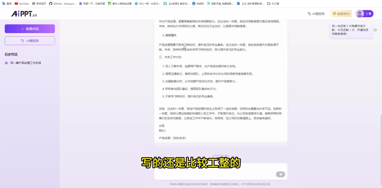 啊,他这里就写出了产品经理的工作总结的一些大纲。啊,写的还是啊比较工整的,也可以生成p p t啊,就写完以后你就去生成p p t,也可以修改啊,复制下载。然后去修改。那比如我在生成p p t。