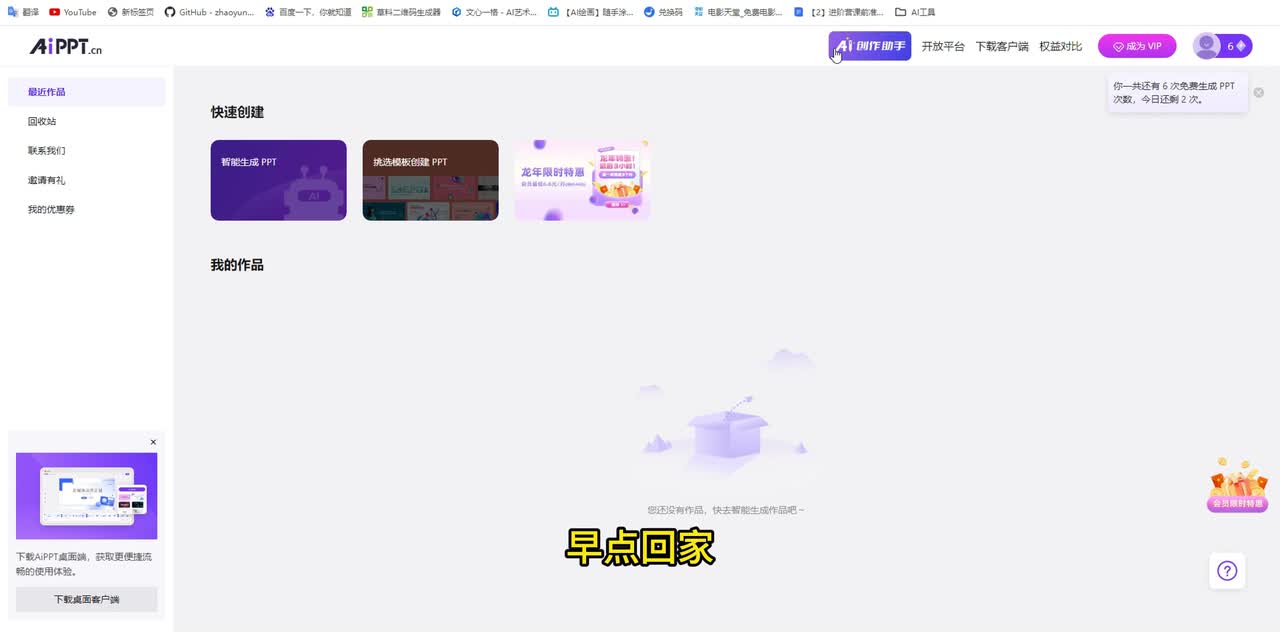 那进来以后呢,我们看到右上角可以有六个免费的电力次数啊,可以免费使用的。然后这里呢有。快速创建,还有挑选模板创建p p t。那我们来试一下。