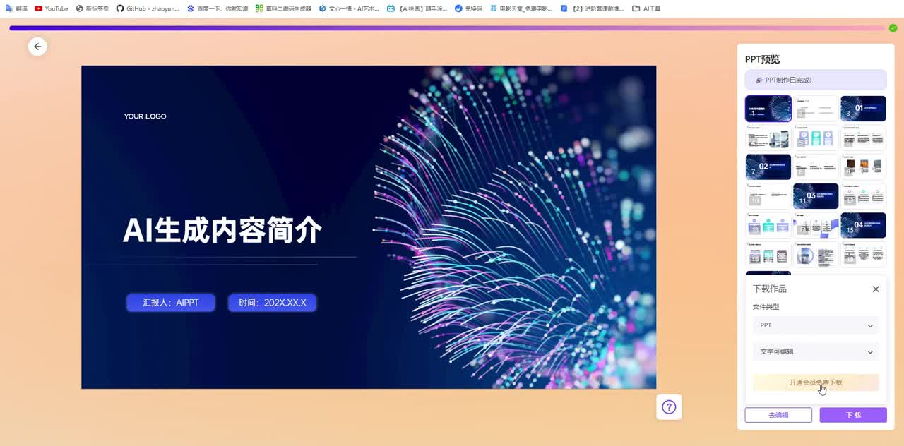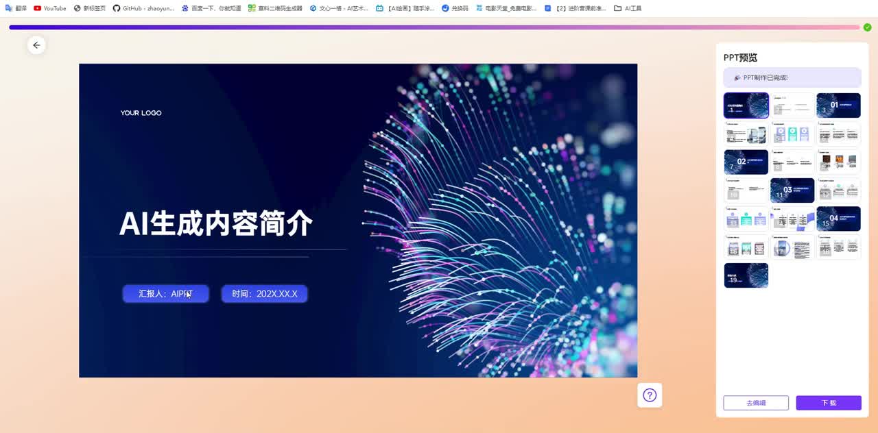 这是内容里。呃,你看刚刚的字体可能会有些大小的问题啊,可以去后面修改,包括logo汇报人。然后这里可以看到这里生成了十九页啊,制作完成。然后我们就可以要不去编辑或者是去下载,我们下载。