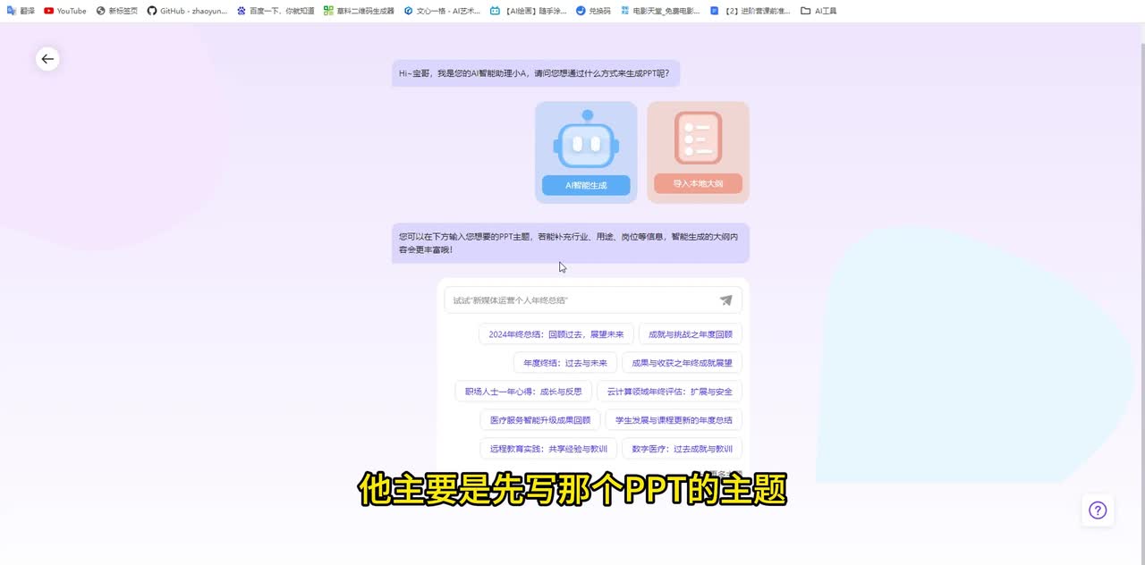 呃,智能生成p p t。这里一个是a i生成,一个是导入本地大纲啊,那我们试一下这个。我们可以看到它主要是先写那个p p t的主题啊,这里有一些呃主题的案例可以试一下。那我写一个比如是。
