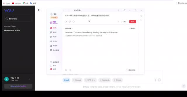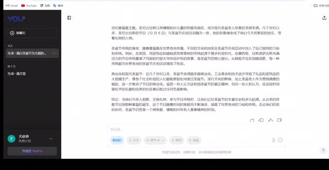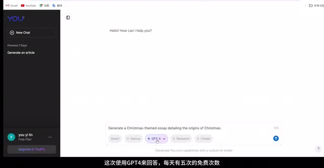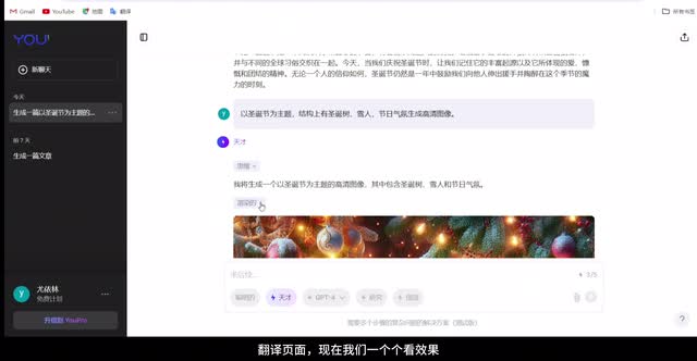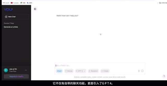 大家好,今天给大家介绍一款基于i人工智能搜索引擎youtube a i。它不仅有自带的聊天功能,更是引入了g p t四,可以生成文章、图像、海报。