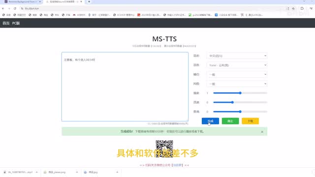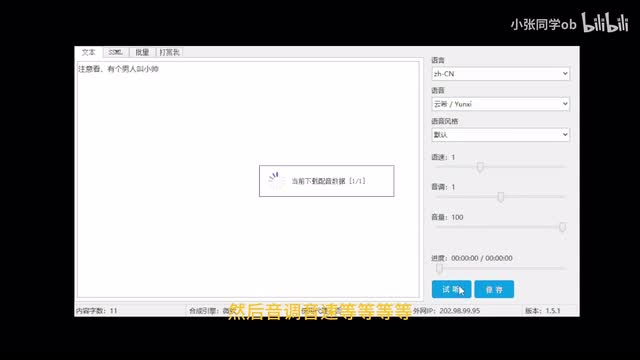 左边是需要转语音的文字,右边可以选择一个人声,然后音调、音速等等等等。弄好之后,我们点击一个试听,注意看有个男人叫小帅。